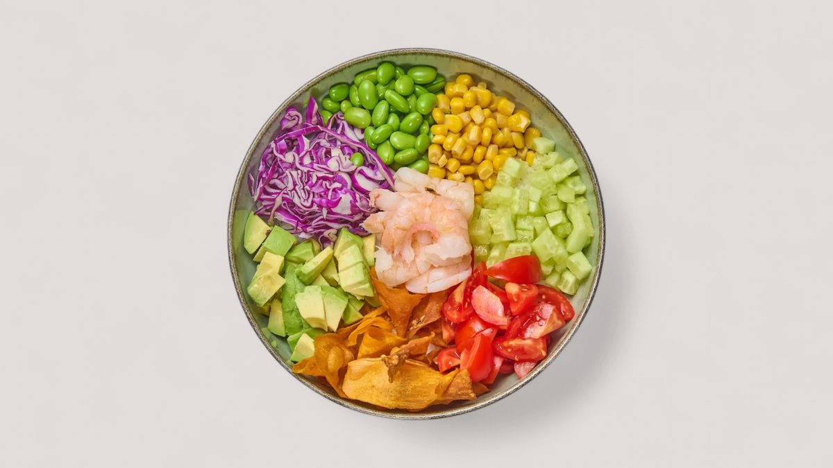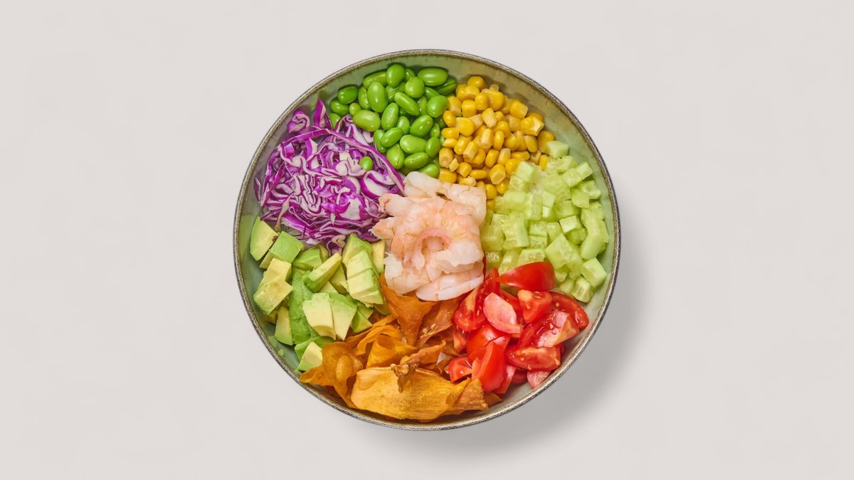 Sočni škampi na posteljici od pirinča, sa edamame pasuljem, kukuruzom, krastavcem, čeri paradajzom, avokadom i hrskavim čipsom od batata, posuto susamom. Sos po izboru.