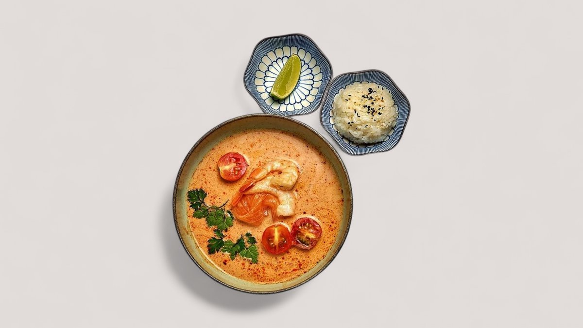 Bujon Tom yum, gambori, paradajz, pirinač, losos, shiitake pečurke