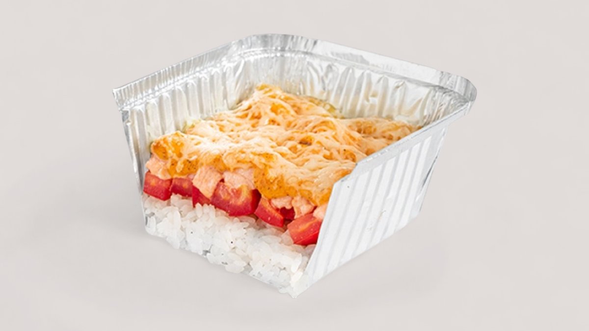 Pirinač, losos, paradajz, konzervirani kukuruz, parmezan, spajsi sos, susam