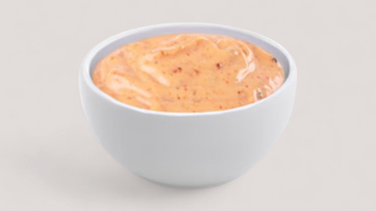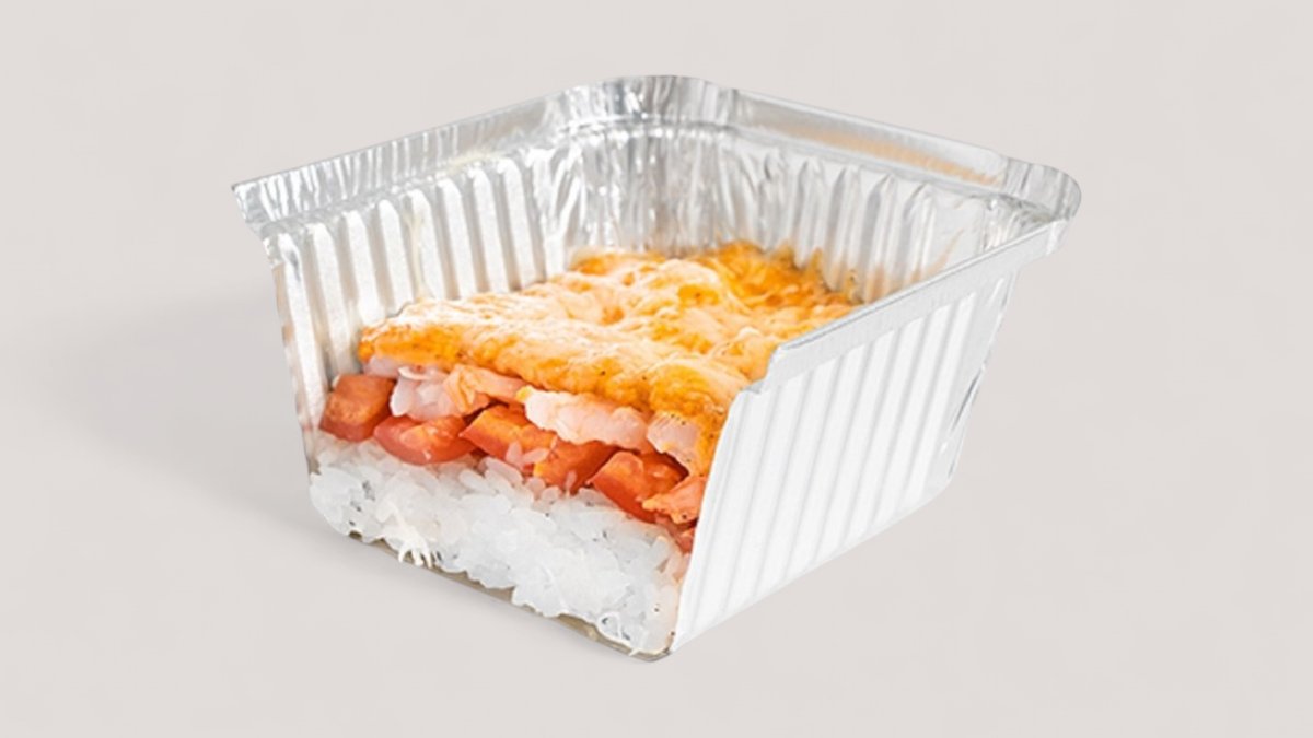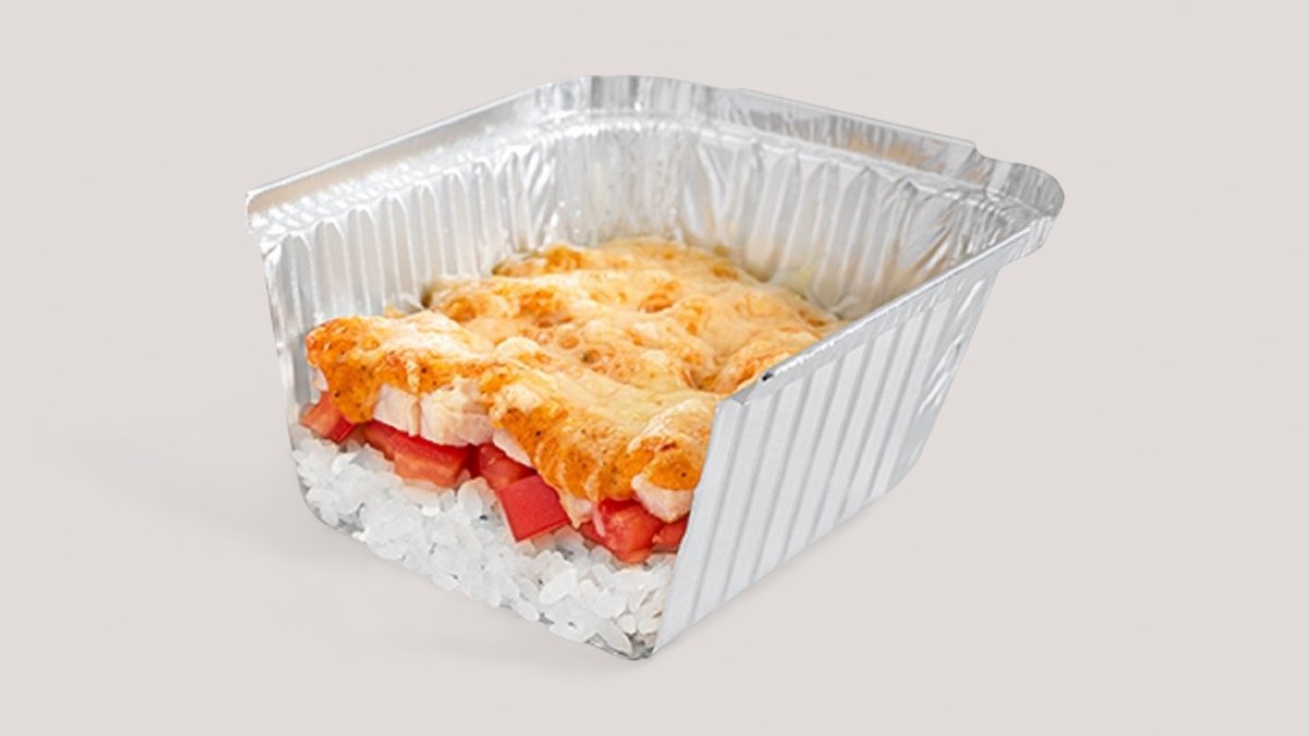 Pirinać, dimljeno pileće meso, kukuruz konzervisani, parmezan, paprika, spajsi sos, susam