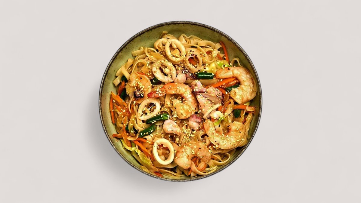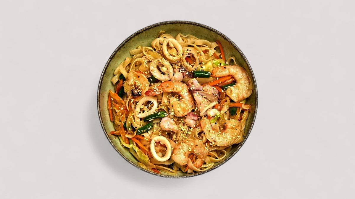 Vok s pirinčanim rezancima, škampima, hobotnicom i lignjama u terijaki sosu
