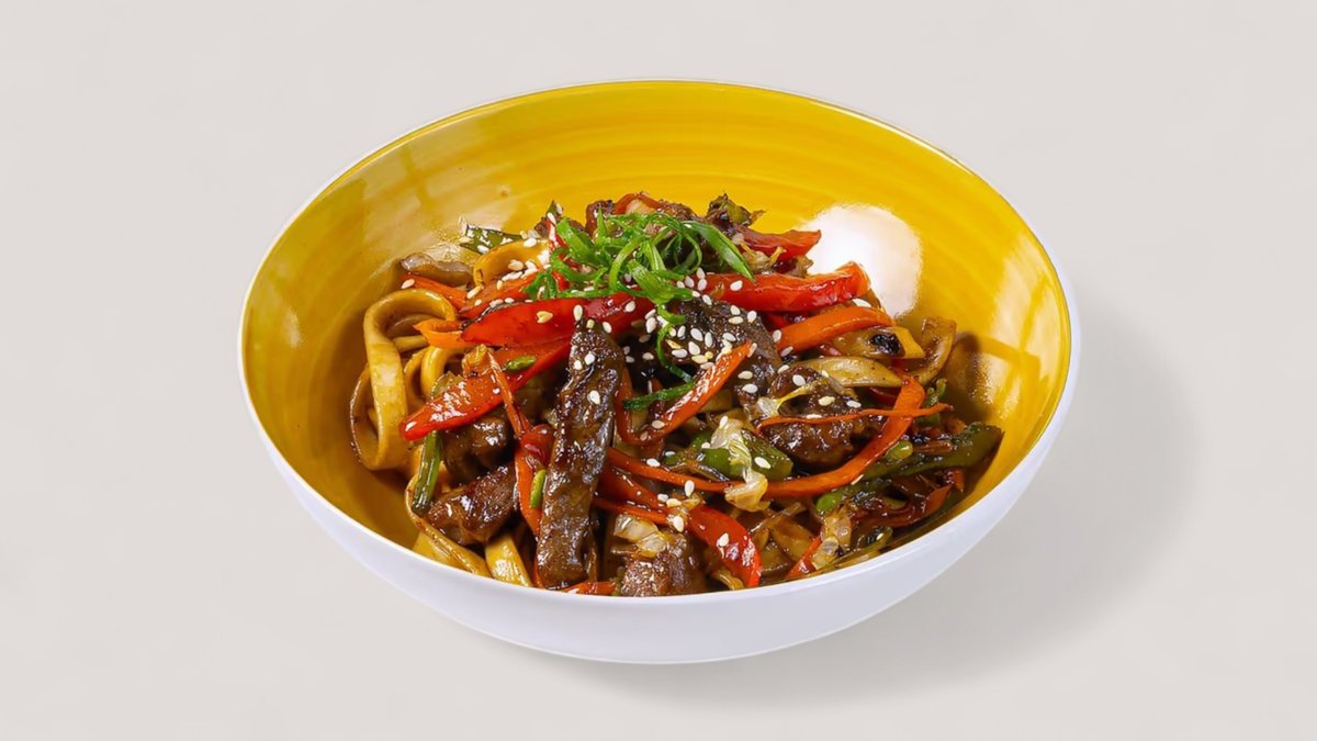 Pšenični udon rezanci, govedina, terijaki sos, susam, slatka paprika, šargarepa, kupus, crni luk, boranija 442 g