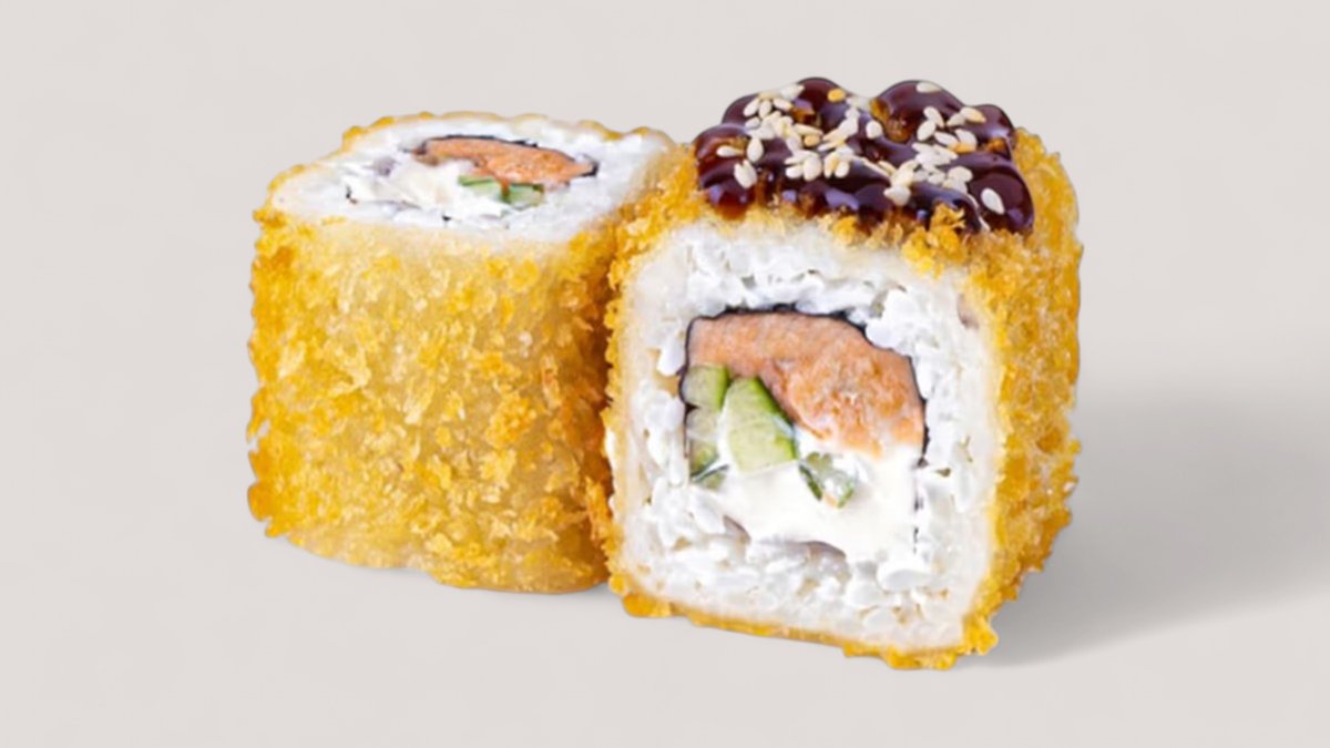 Rolnice sa lososom, krem sirom, krastavcem, prženim lukom i Spajsi sosom