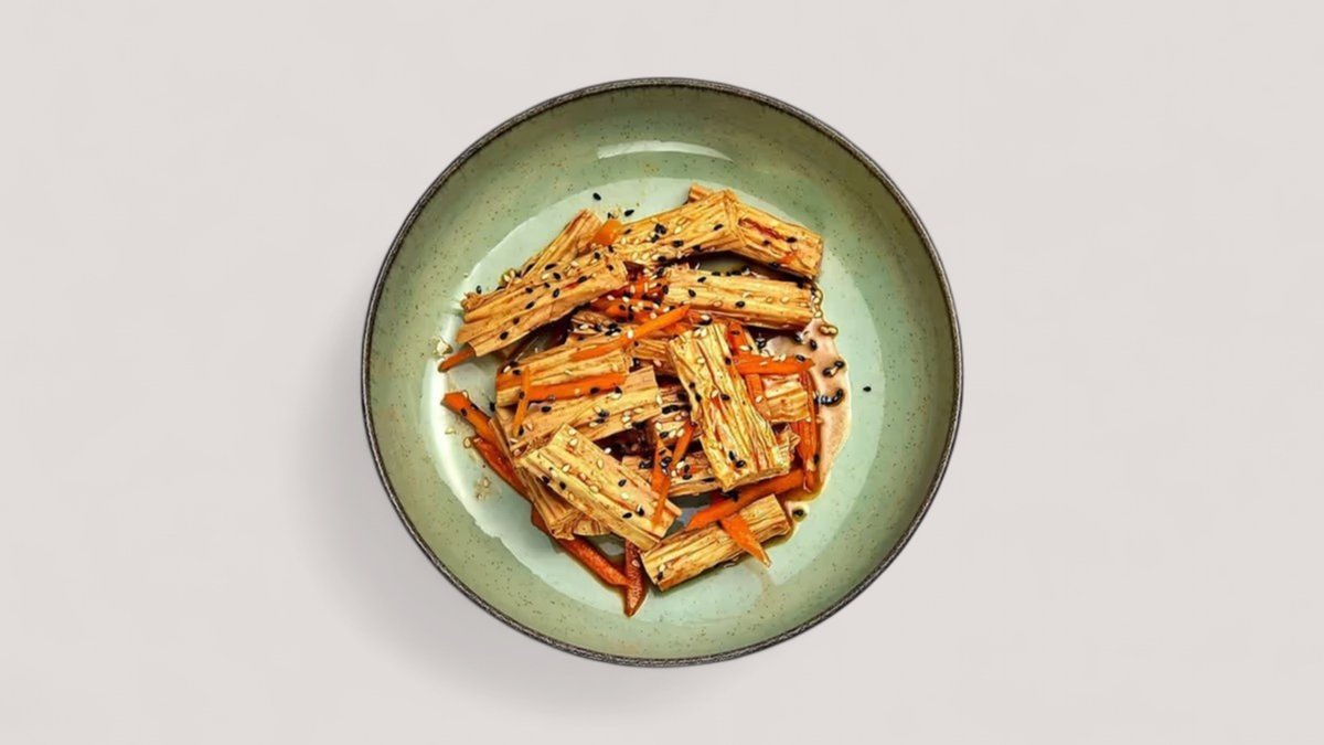Lagano pikantno jelo od sojine kore (fudžu) i šargarepe, začinjeno soja sosom, sirćetom i uljem, posuto susamom. (150 g)