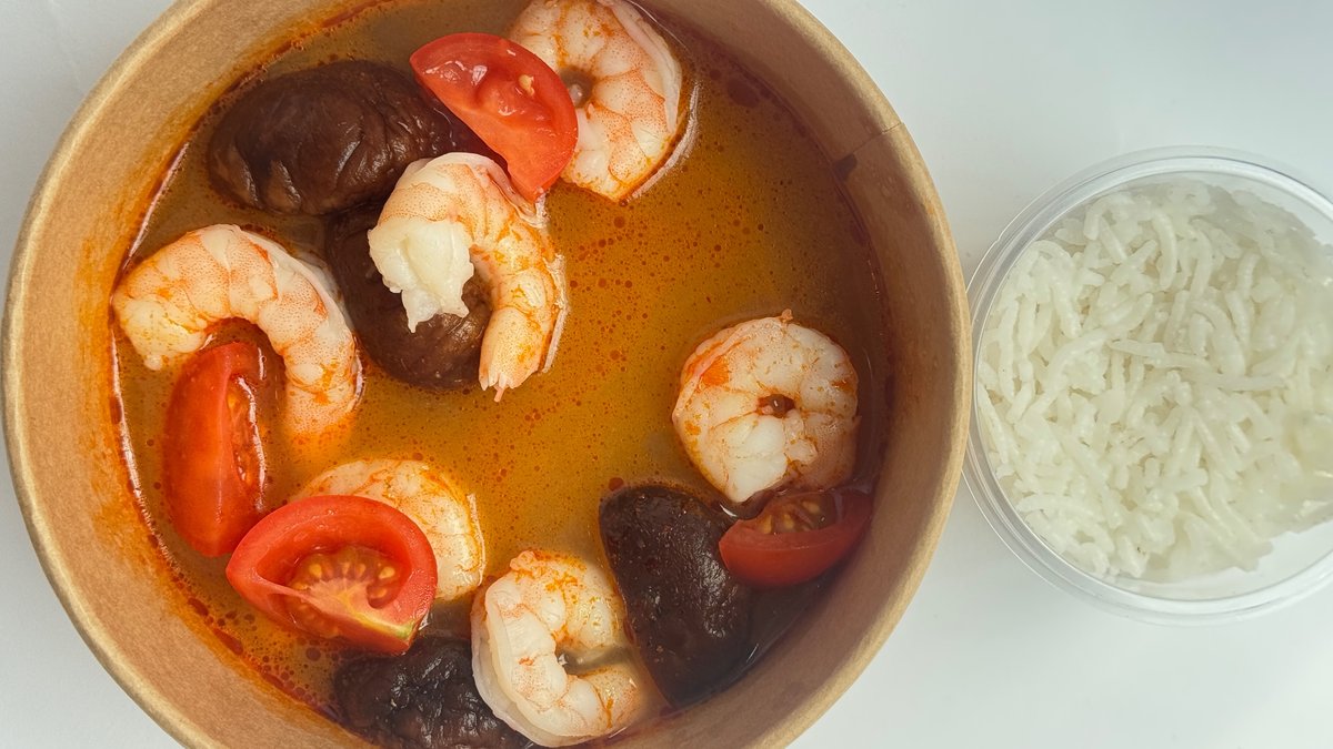 pileći bujon 200g, kokosovo mleko 20g, tom yum pasta 8g, sos od ribe 10g, gambori 50g, basmati pirinač 80g, cheri paradajž 35g, šitake 30g kcal 278.8 / masti 10.11 / UH 35.13 / protein 17.80 / vlakna 2.31