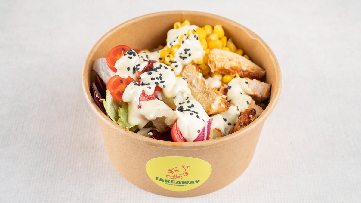 PIletina, pirinač, kukuruz, mix salata, čeri, dresing, crni susam