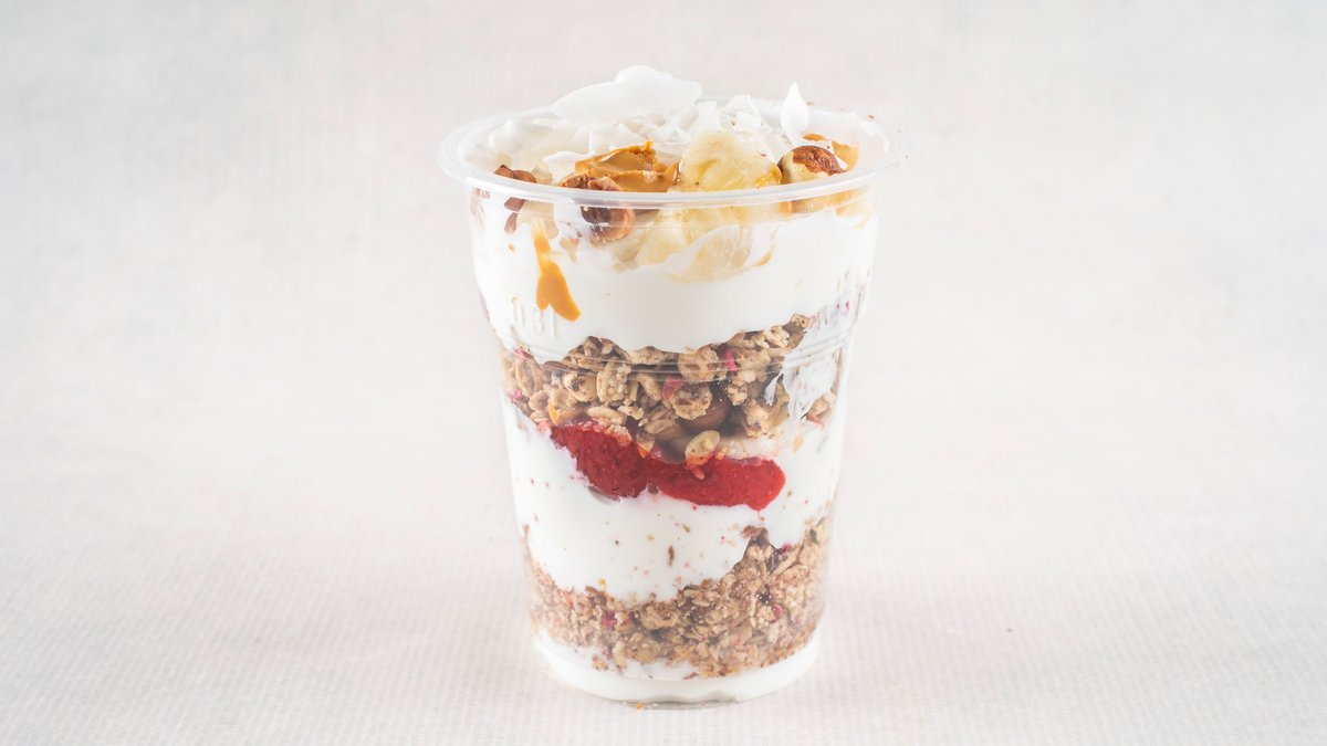 Granola, grčki jogurt, med, kikiriki puter, šumsko voće, banana
