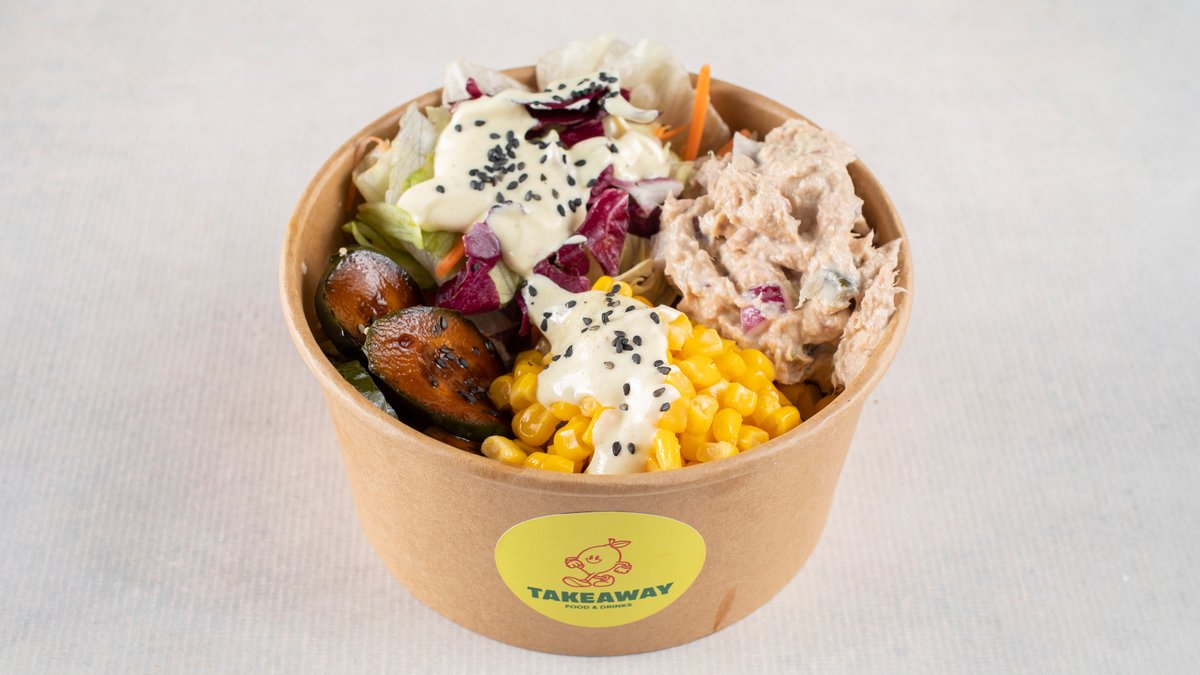 Tunakado, pirinač, marinirani krastavac, kukuruz, mix salata, dresing, crni susam