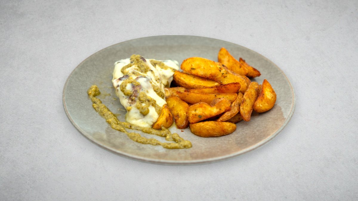 Pohovani pileći file, serviran na kremastom parmezan sosu sa domaćim začinjenim krompirima i parmezanom