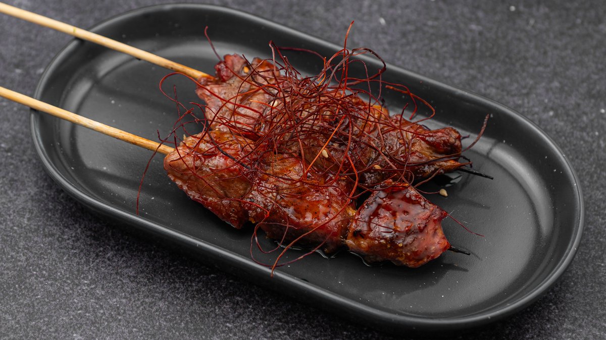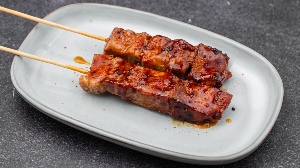 Japanski grill ražnjići od svinjskog i goveđeg mesa u savremenoj izakaya tehnici.
