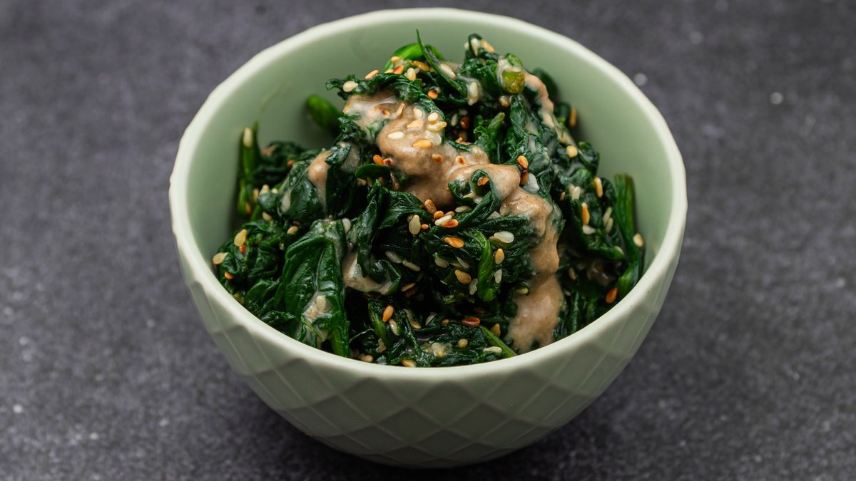 Spanać u slatkom -susam prelivu. Hladno, aromatično, pravi izakaya zalogaj.
