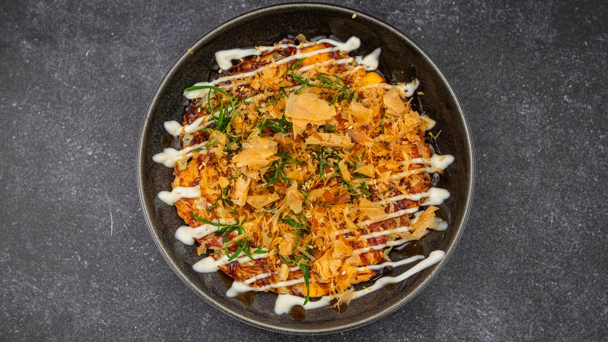 Japanska „palačinka sa stavom“ — kupus, jaje, sosovi koji mirišu na Osaku i nežni losoos. Sočno, bogato i nežno. Topping: japanski majonez, okonomiyaki sos i katsuobushi (tuna flakes). Sočno i jako ukusno.