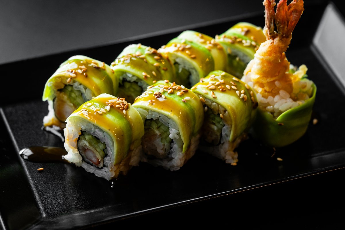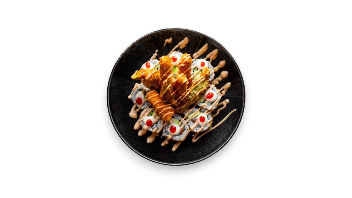 Osvežavajući shrimp roll u modernoj izvedbi. Kraljevski gambor u tempuri, avokado i krastavac. Obmotano tobikom i tenkatsu mrvicama, završeno teriyaki i aurora sosem.