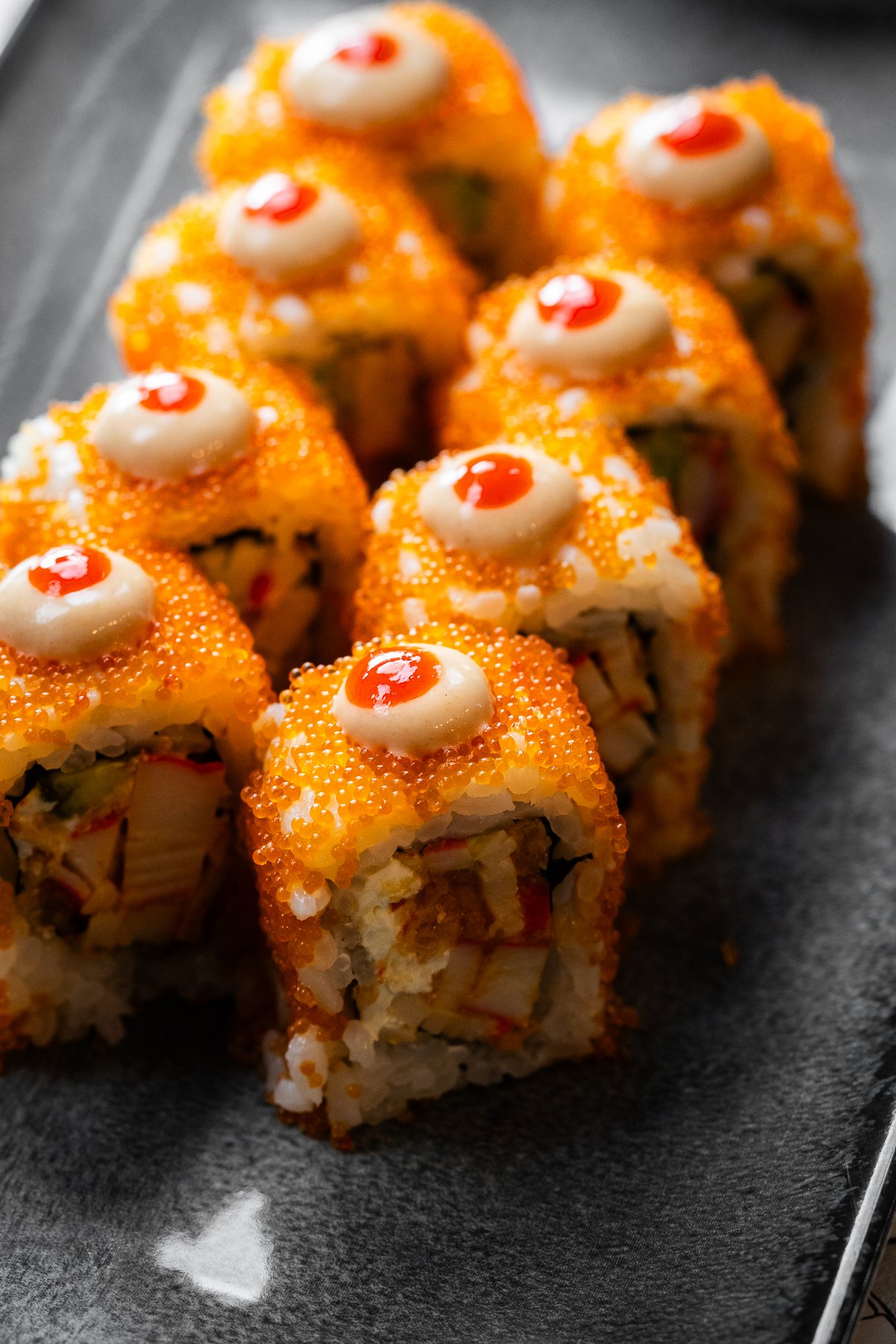 Sveže, svetlo, elegantno — idealno za nove sushi goste. Surimi kraba, avokado, krem sir, umotano tobikom.