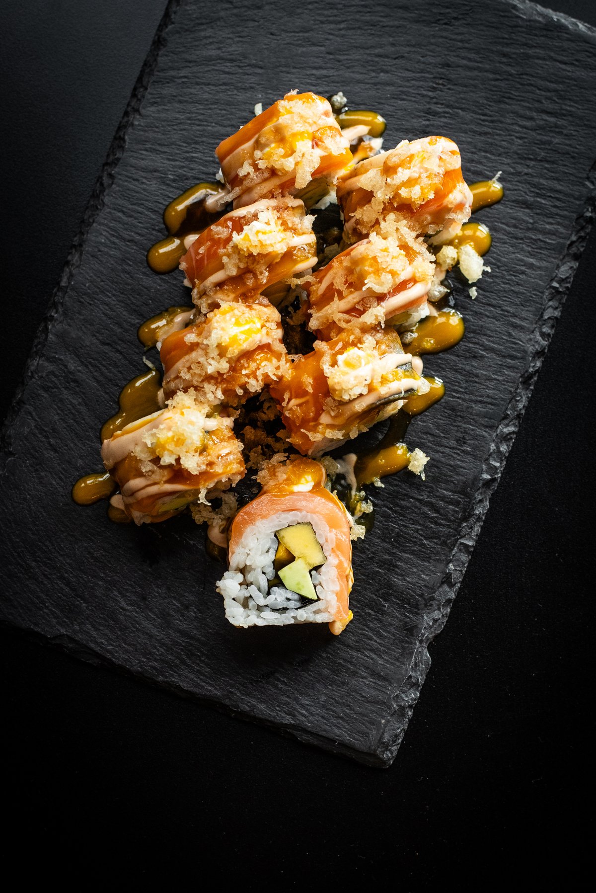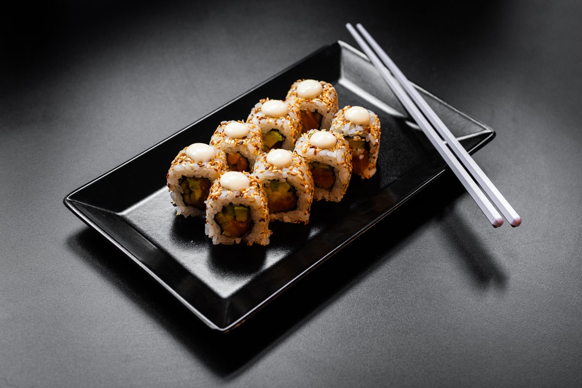 Bogata obrok rolnica od lososa sa deep-fried slojem za dodatnu punoću. Losos, avokado, krastavac, susam, sriracha, japanski majonez i aurora sos, upotpunjeno tempura komadima lososa i avokada.
