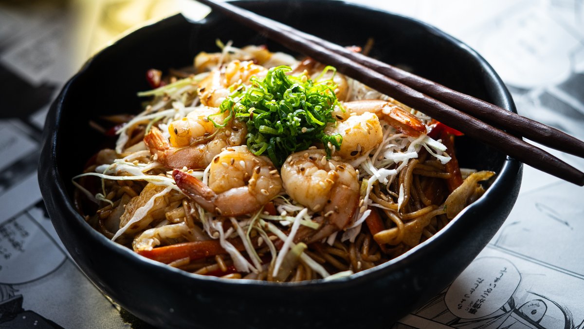 Stir-fry japanske nudle sa škampima, povrćem i bogatim yakisoba sosom. Umami sa laganom morskom notom.