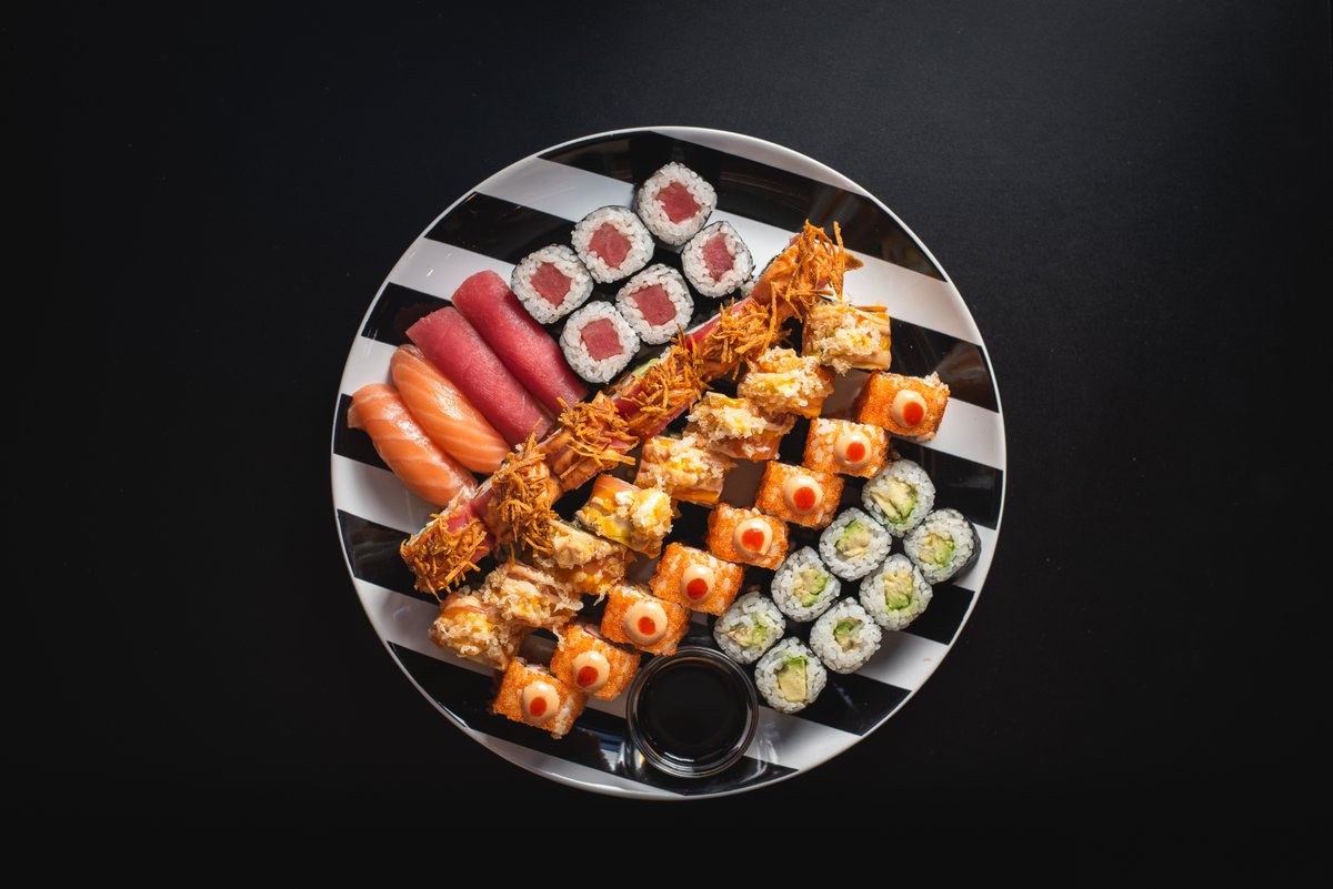 Veliki set za deljenje — avokado hosomaki rolls, tuna hosomaki rolls, 2x tuna nigiri, 2 x losos nigiri , Shibuya Crunch, Coral Kiss i Neon Tide. Razigrano, dinamično i stvoreno za sto i ekipu.