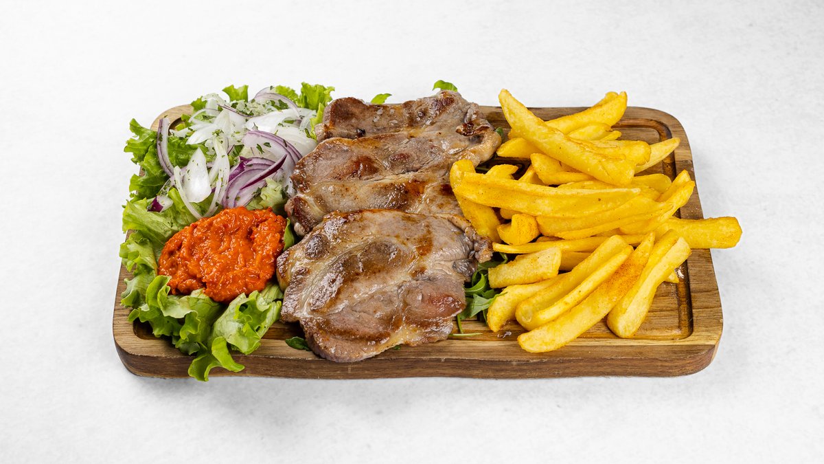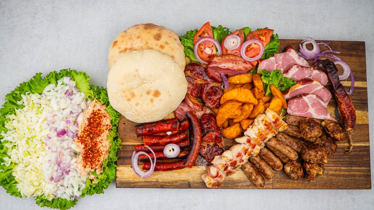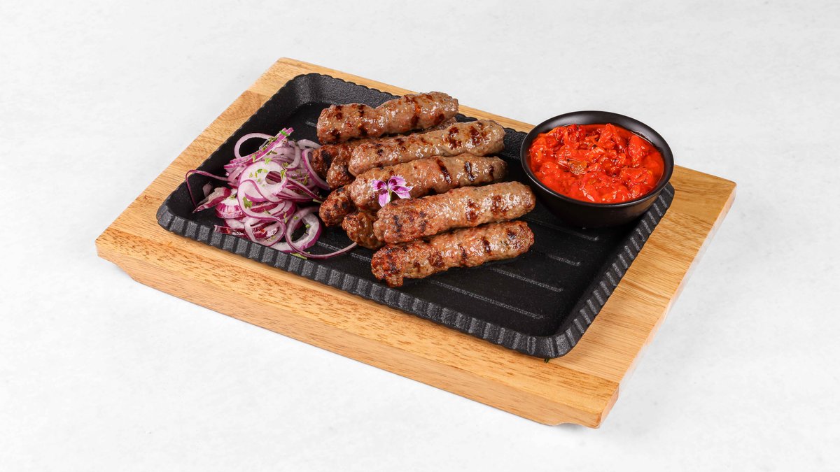 Ćevapi sa lukom , leskovački uštipci, roštiljska kobasica, rolovani pileći ražnjići, dimljena vešalica, dimljeni vrat Prilozi: začinjeni krompir 500g, salate 500g, lepinje 4 komada