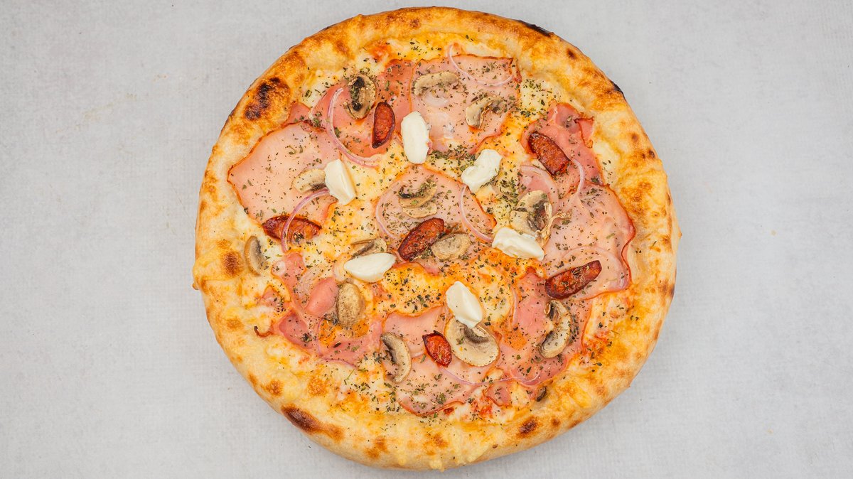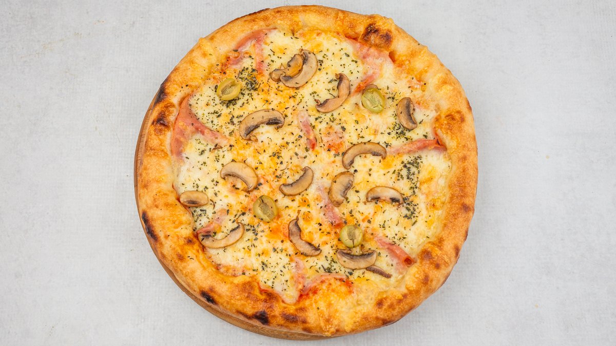 Pelat, kačkavalj, šunka, pečurke, masline, origano