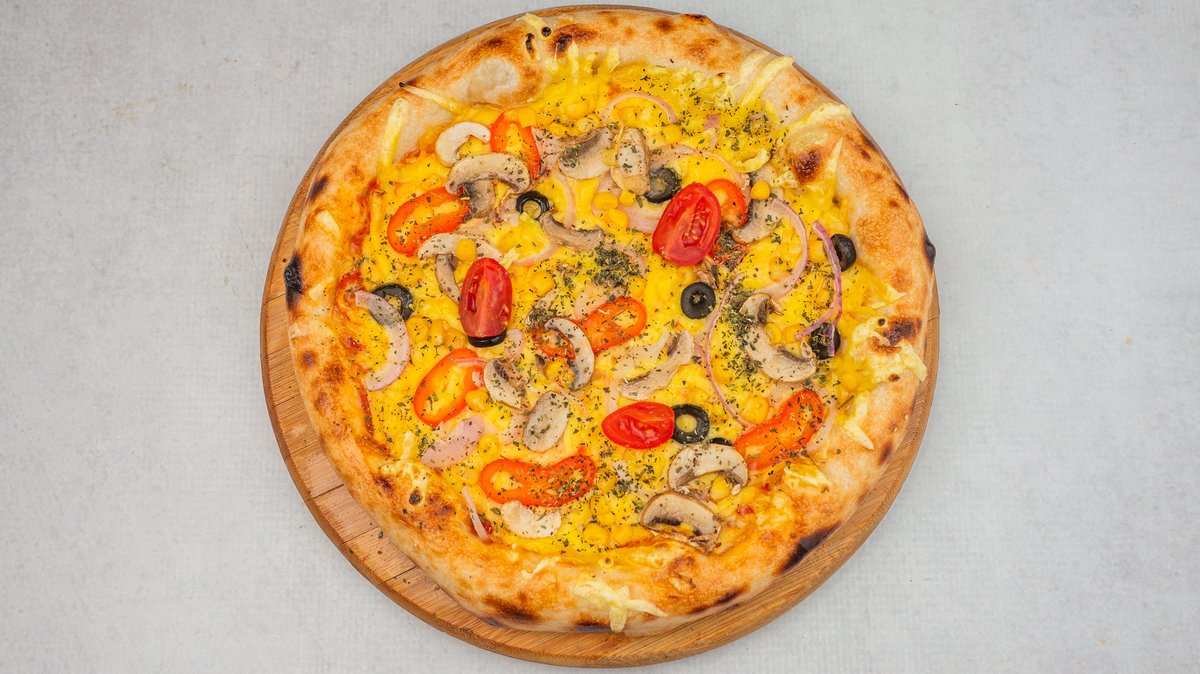 Pelat, biljni kačkavalj, pečurke, paprika, kukuruz, crne masline, crveni luk, cherry paradajz, origano