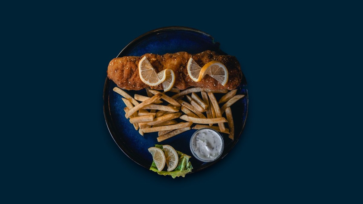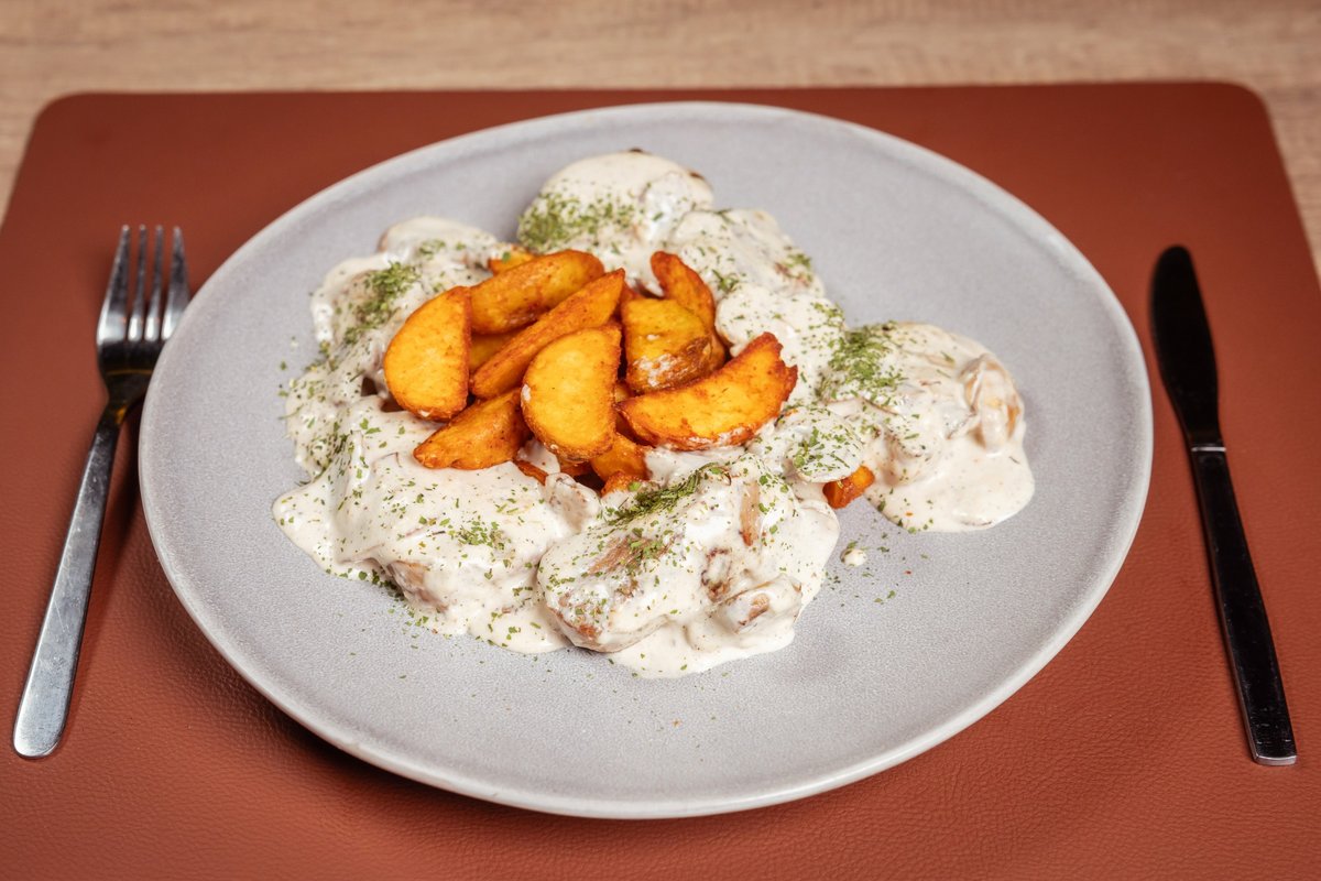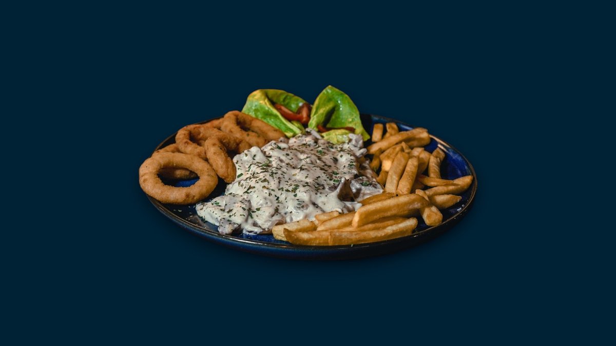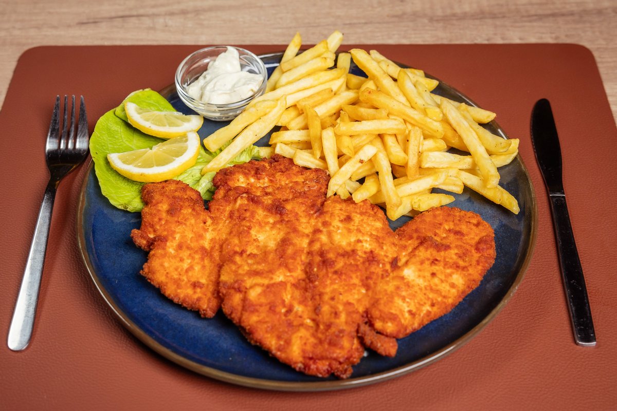 Pohovani pileći file, pohovani kačkavalj, pavlaka, coleslaw salata, pomfrit