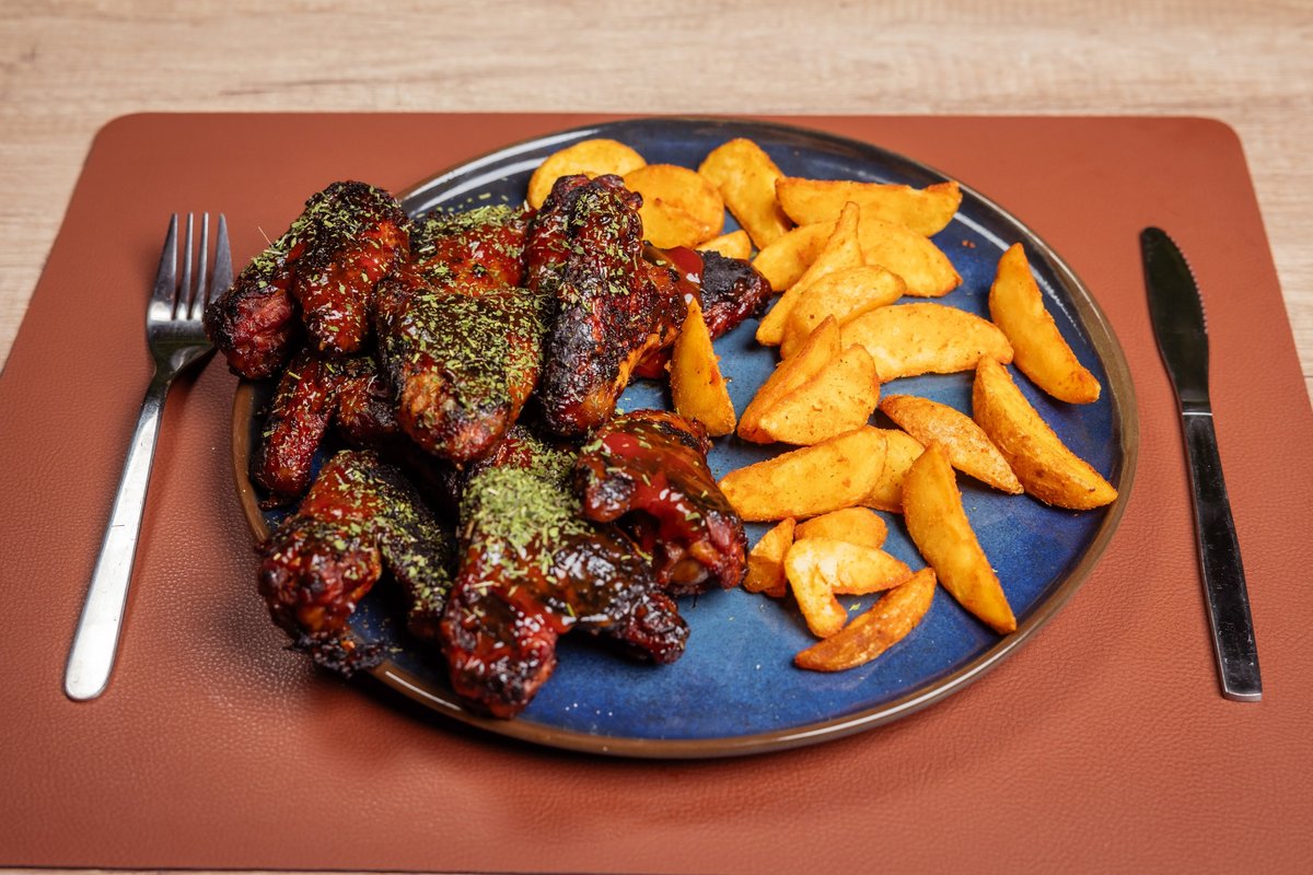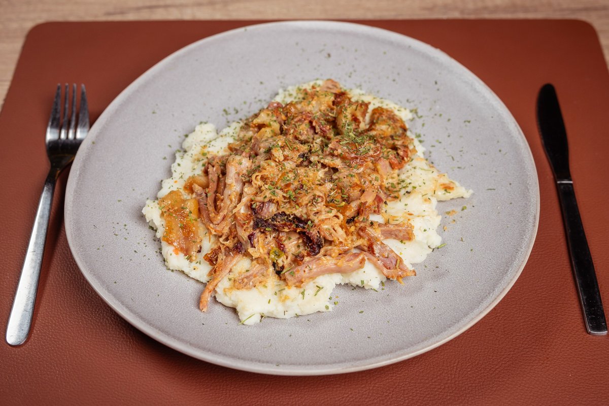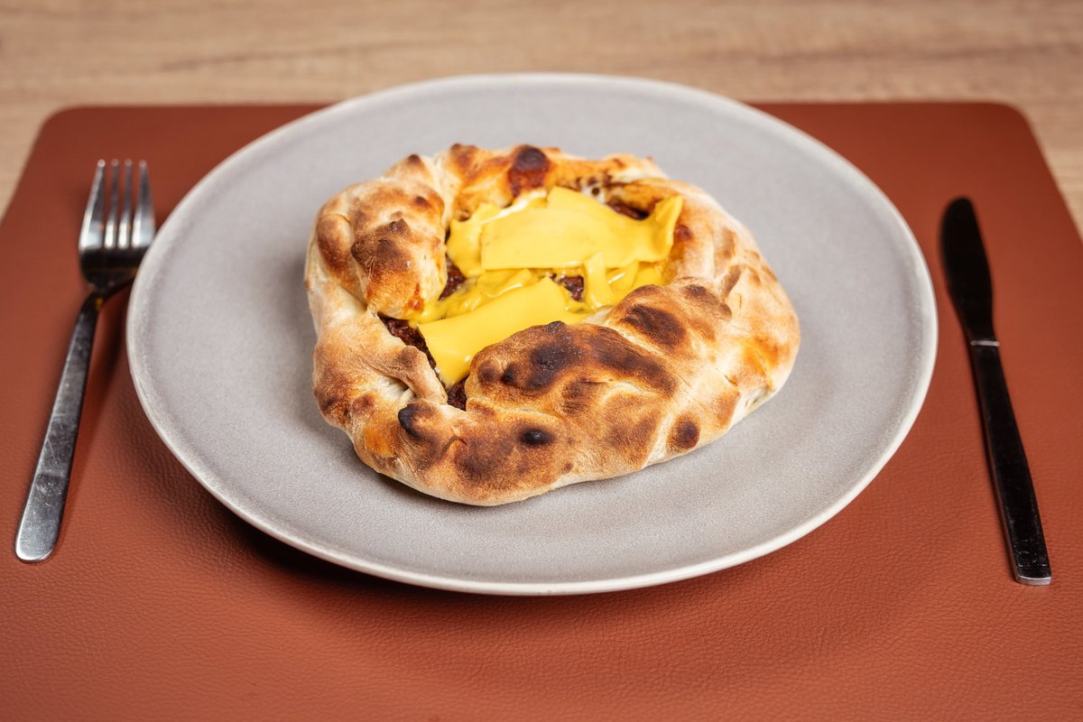 Meso, čedar sos, čedar sir, kornišoni, paradajz, luk, burger sos, pomfrit