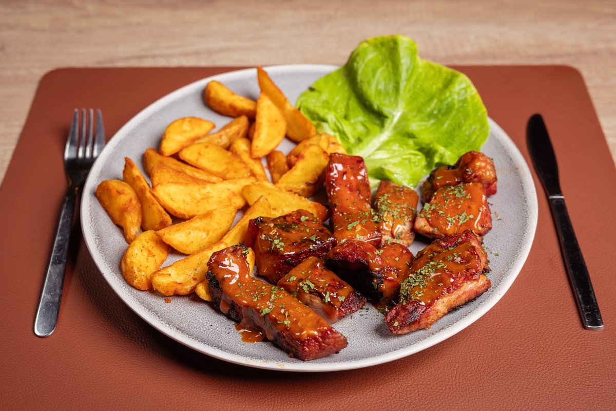 Meso, paradajz, zelena salata, kečap, burger sos, pomfrit
