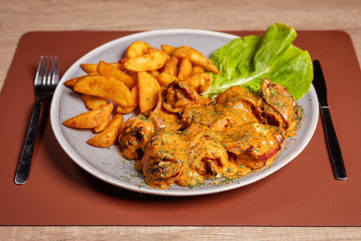 Pileći file, pečenica, pančeta, gauda, jaje, paradajz, zelena salata, pomfrit