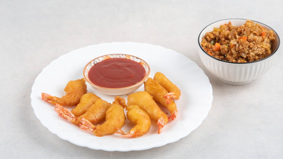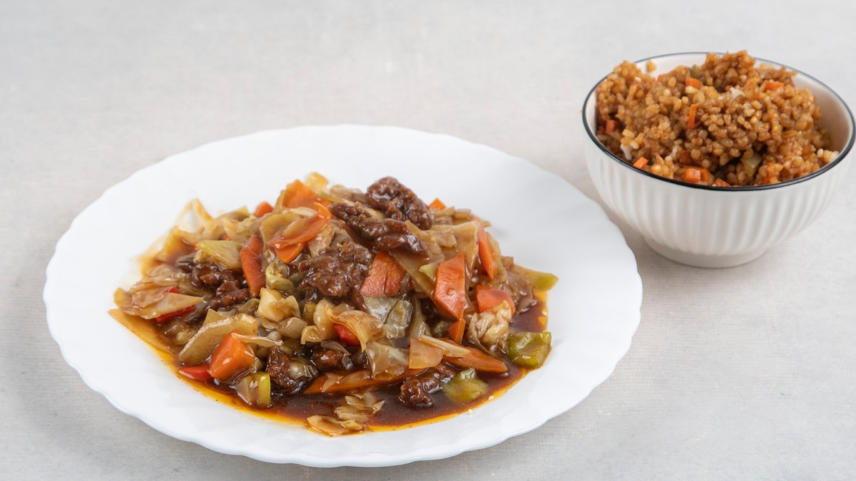 1 x S/S piletina, 1 x goveđi foo yong, 1 x škampi sa indijskim orahom, 1 x prženi pirinac/nudle sa jajima