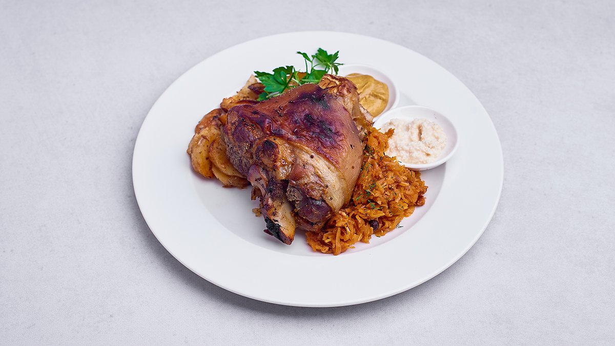 Tradicionalno sporo kuvano jelo od juneće kolenice servirano sa pireom i kuglom kajmaka