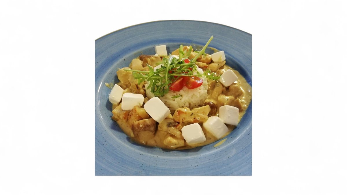 Ćureći file, vrganj, šampinjoni, pirinač, feta sir, crni luk, belo vino