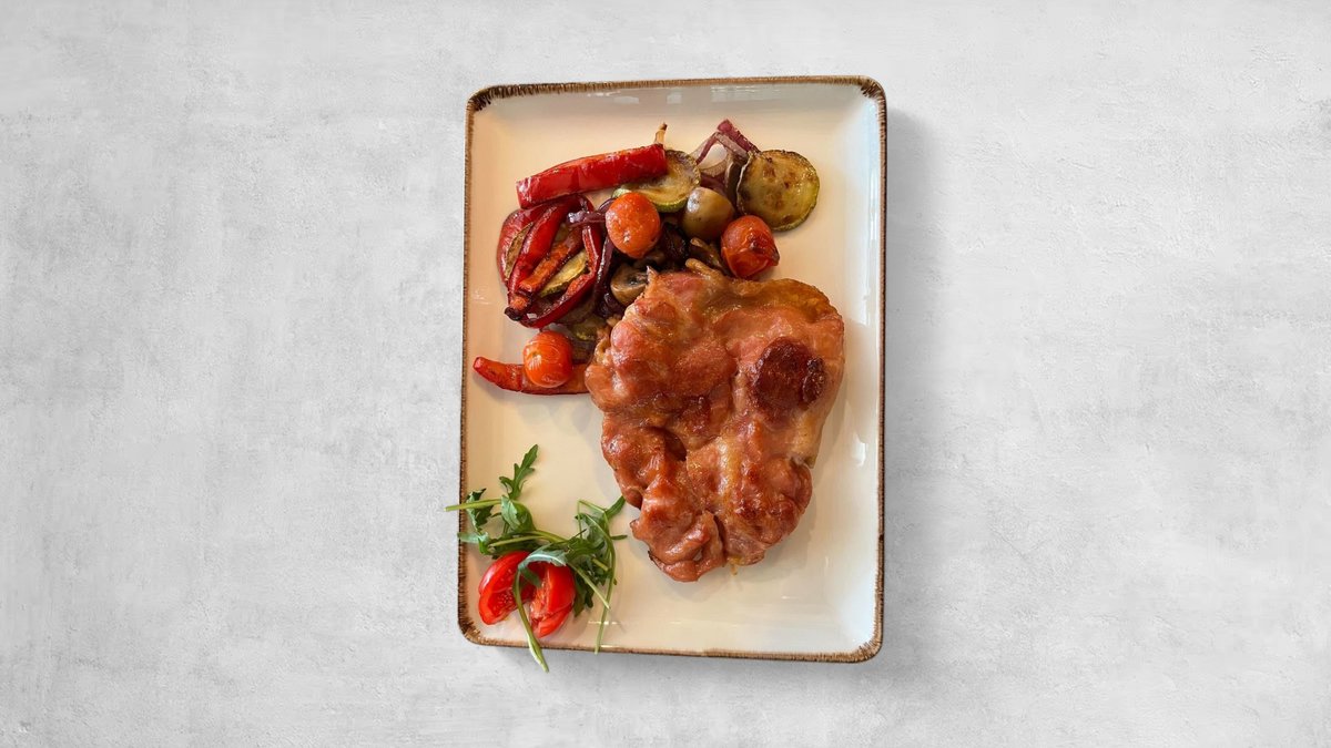 Dimljeni batak 0.250 gr i grilovano povrće, tikvica,paprika,crveni luk,sampinjoni,cheri