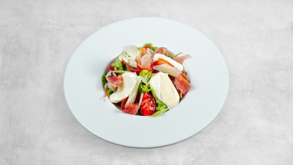 juneći burger na miksu zelenih salata na tartar dresingu, pohovana mocarela i hrskava pršuta