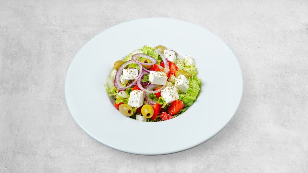miks zelenih salata, paradajz, krastavac, luk, kukuruz, tunjevina i masline