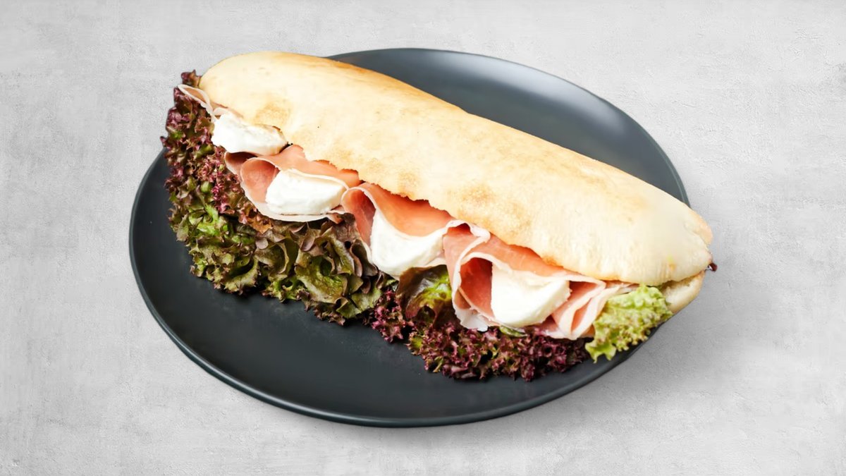 pesto sos, mocarela, pršut, paradajz, rukola i pomfrit