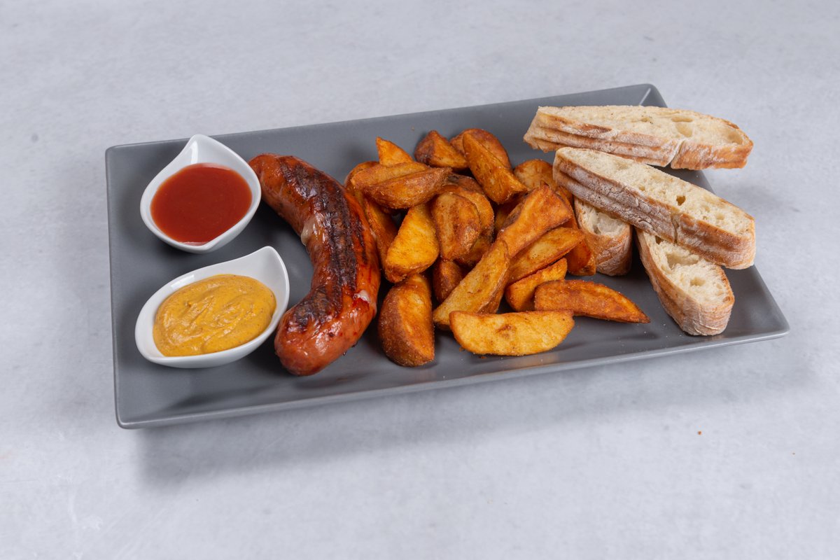 dve kobasice, onion rings, kari kečap, senf, rukola i čeri sa začinjenim krompirićima