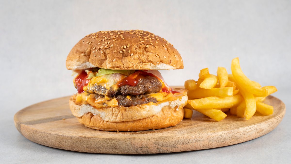 burger od junećeg mesa, hrskava slanina, miks salata, paradajz, kiseli krastavac, čedar i krompirići