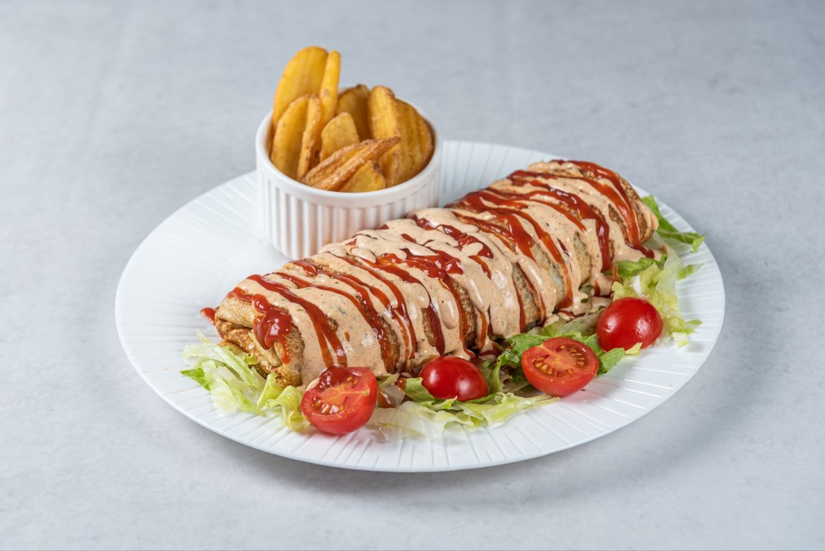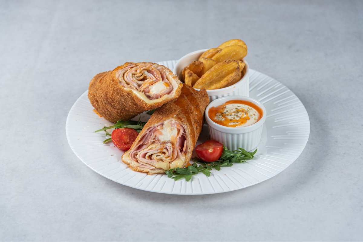 pavlaka,topljeni sir, šunka, pečenica, ljuti sos, prilog Crispy krompir