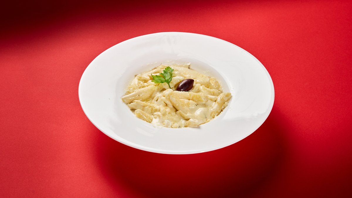 Penne, neutralna pavlaka, bergablu, ementaler, mocarela, parmezan, ruzmarin, maslinke