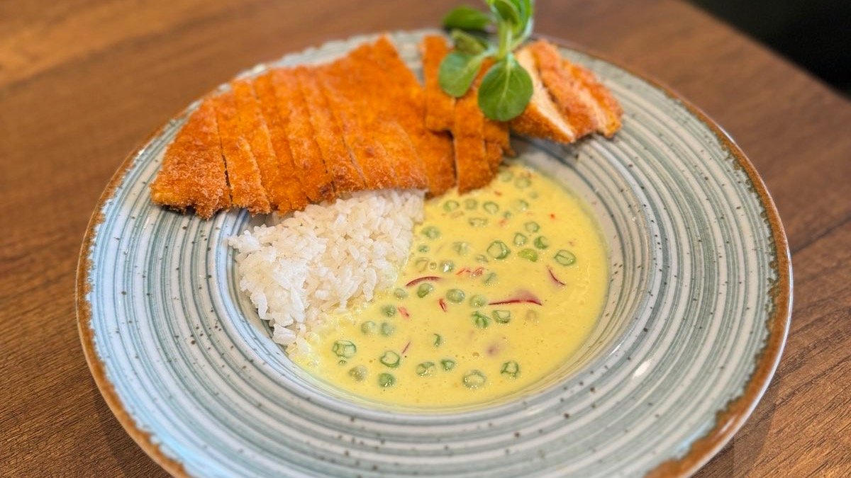 Piletina panirana panko prezlama, blago ljuti kari sos, paprika, grašak, neutralna pavlaka, pirinač