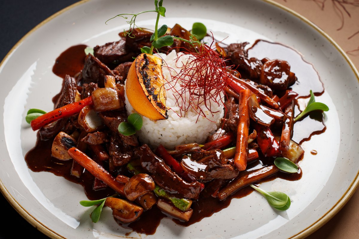 Juneći file mariniran u Oyster sosu, začinjen čilijem i đumbirom, sotiran sa svežim povrćem u woku, serviran uz arborio pirinač.