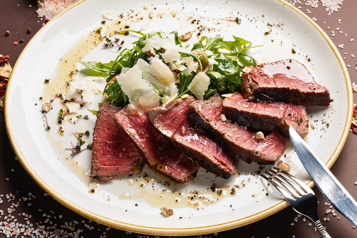 Marinirani biftek, sečen na taljatu, poslužen na podlozi od rukole, sušeni paradajz, badem, listići parmezana, aćeto balsamico krema, extra virgin maslinovo ulje, biber crni mleveni