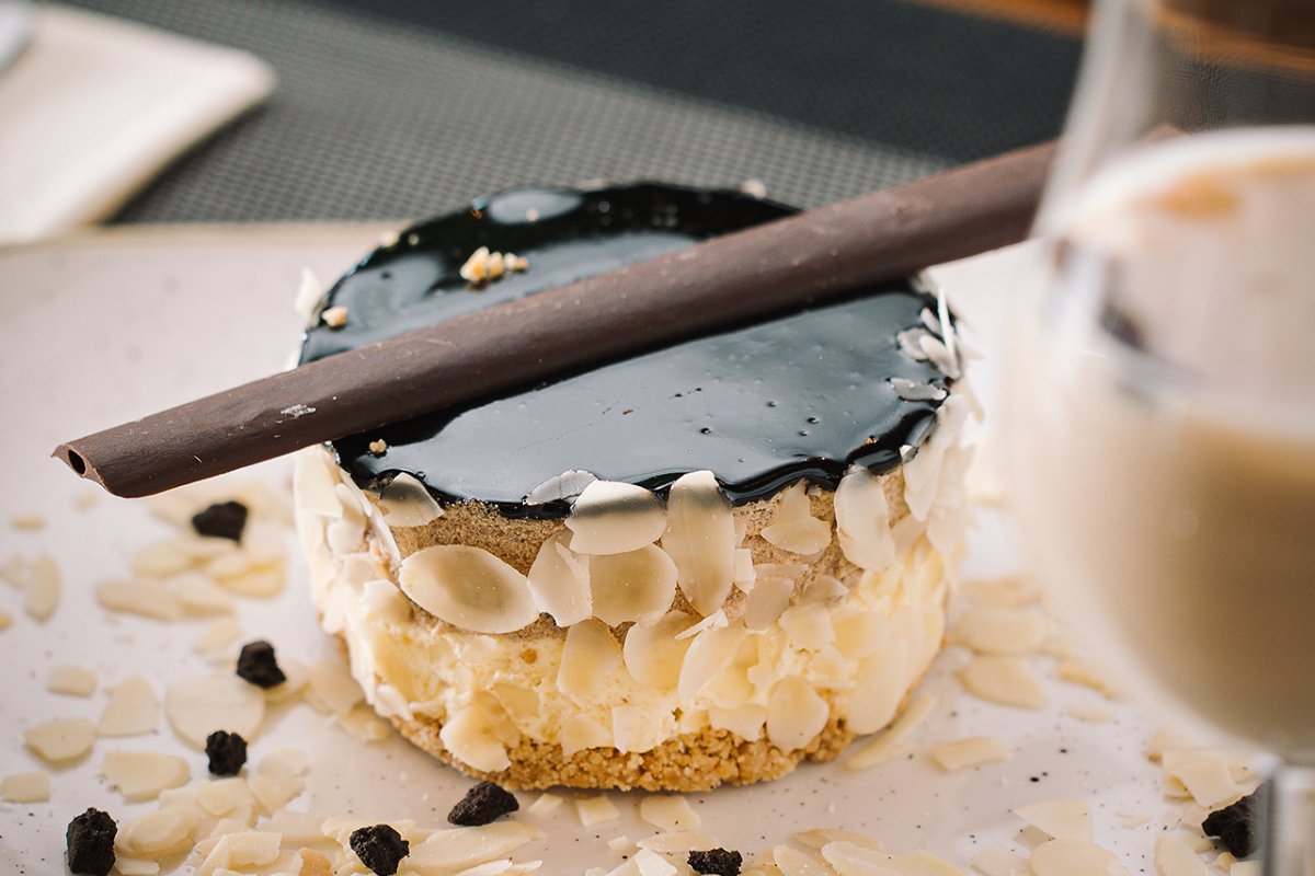 Bela čokolada, nocciola krem, biscoto pasta krem, maslac, slatka pavlaka, vanil krem, listići od badema, slatka pavlaka, crunch mlečne kuglice