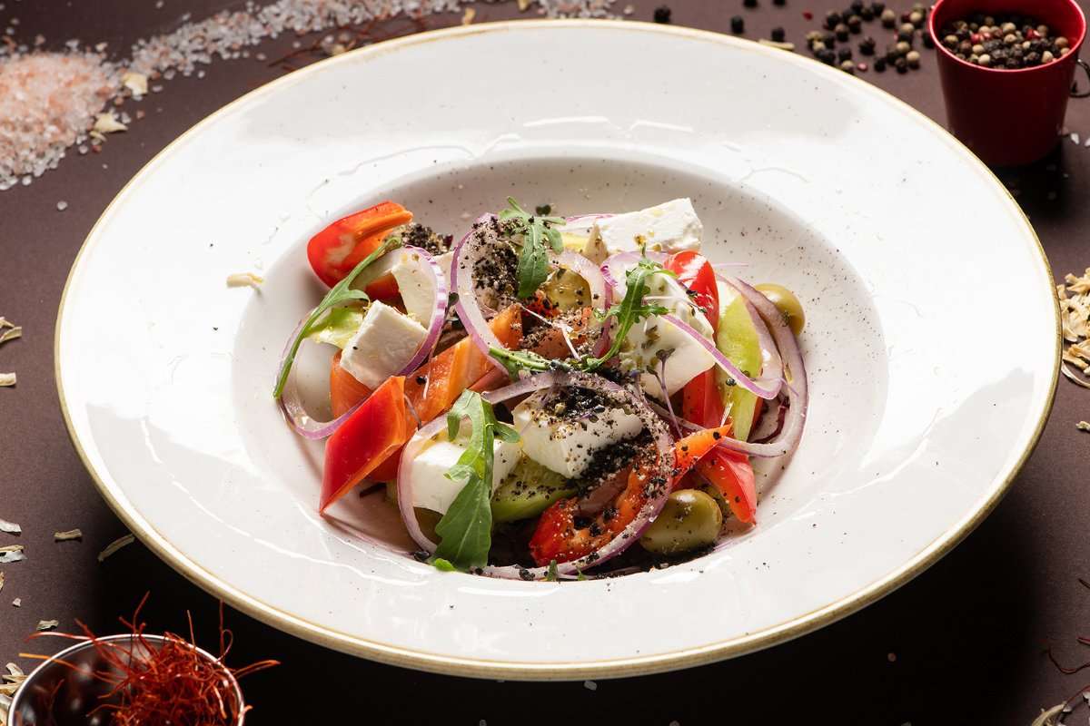 Paradajz, krastavac, paprika, crveni luk, masline, feta sir, origano, so, extra virgin maslinovo ulje