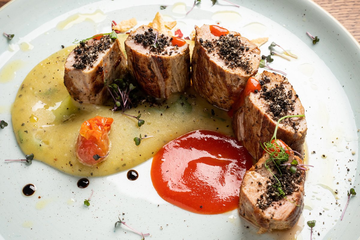 Marinirani svinjski file, sos od kulena, aromatični pire krompir sa nanom