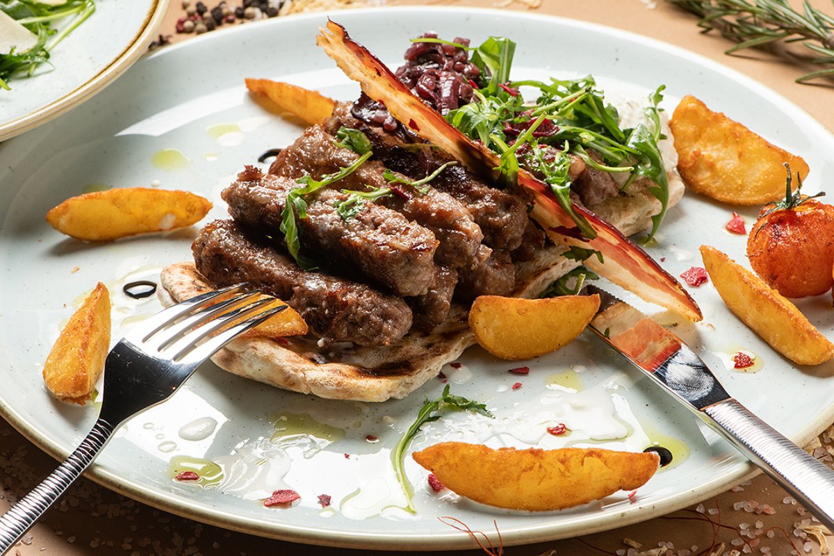 Juneći ćevapi, servirani uz kajmak i pomfrit.