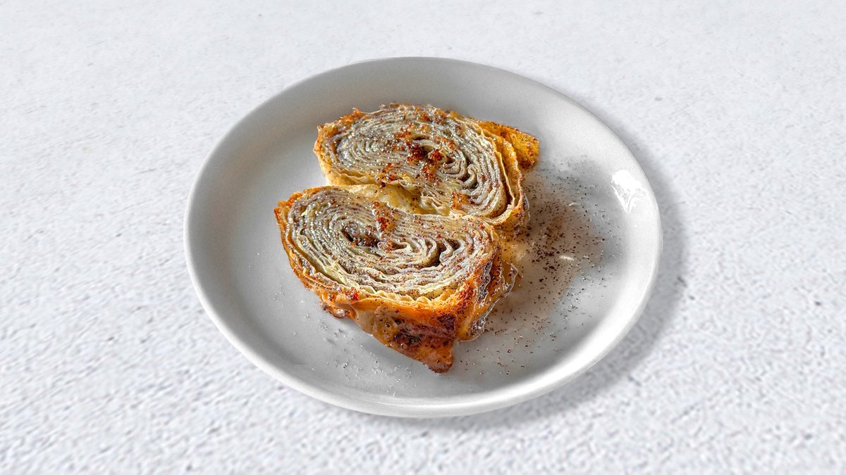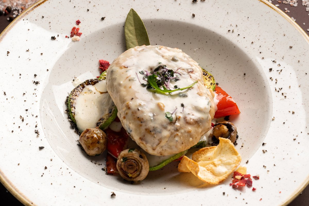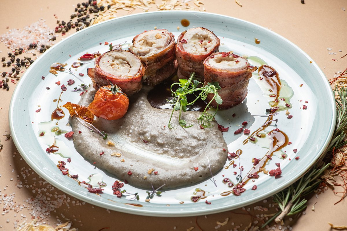 Pileći file punjen sa dve vrste šumadijskog sira, rolovan u pančeti, poslužen uz pire od krompira i tartufa.