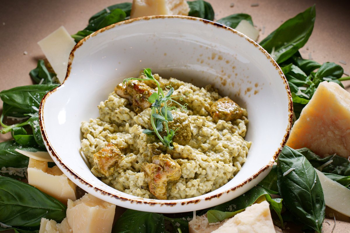 Pirinač arborio, grilovani pileći file, neutralna pavlaka, parmezan, maslac, pesto sos
