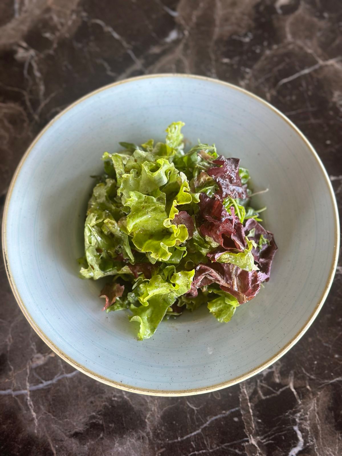Miks zelenih salata, marinirani biftek, listići parmezana, mrvljeni lešnik sa dresingom od senfa i meda.