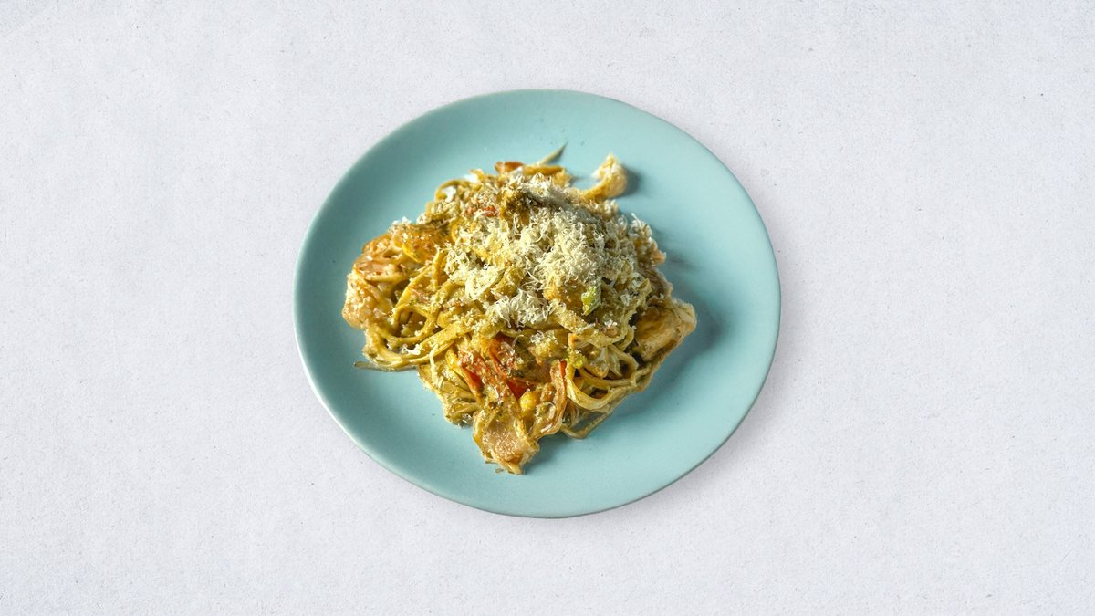 Taljatele, grilovani pileći file, pesto sos, neutralna pavlaka, tikvice, praziluk, čeri paradajz, parmezan, mrvljeni badem, biber crni